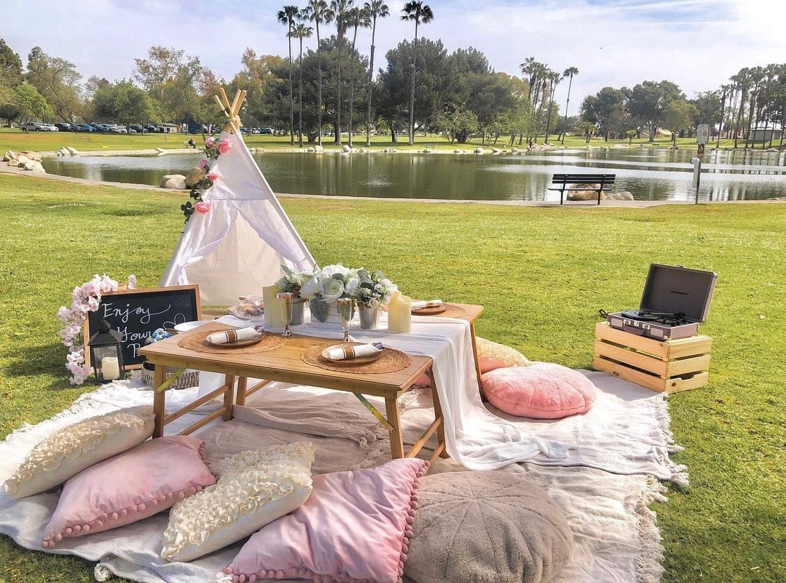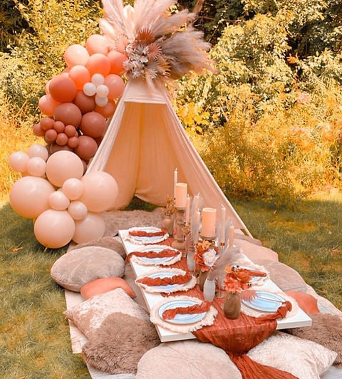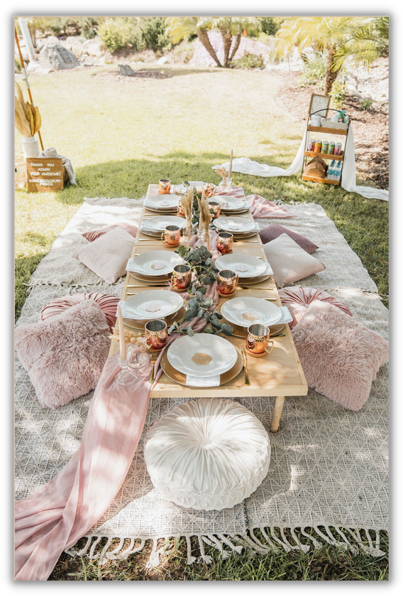 This package includes a luxurious bohemian picnic setup for two. Private Bubble Tent Low wooden picnic table, Floral Arrangment. Assorted pillows and rugs/blankets. Picnic decorations. Small bites (turkey subs, fruit tray) 1 Romantic Game + Lawn Game